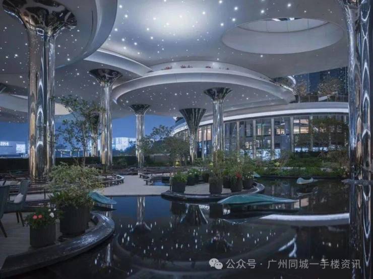 二展取浩渺江波与水系演变的形态,让水与园林无界交融。首层无边际锦鲤池,与穹顶星空共同辉映绮丽生活。