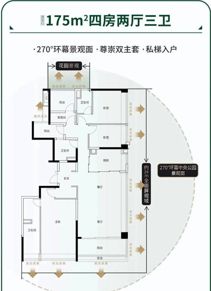建面175平四房三卫,270度全面边厅设计,公园景观面大道29米