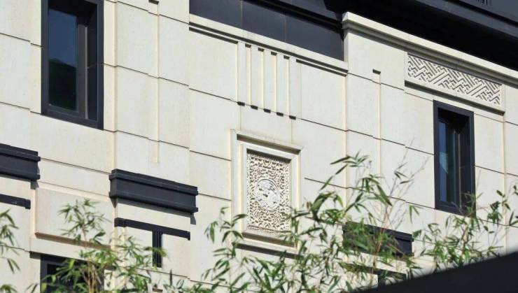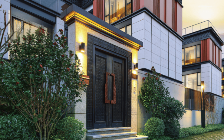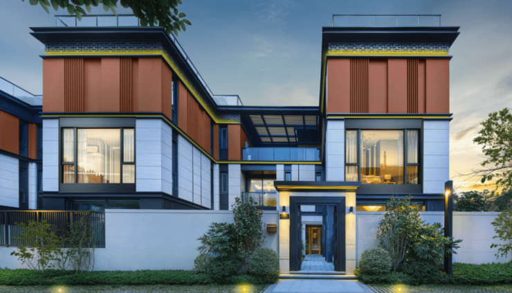 项目取法皇家院落规制,通过威仪府门、镇宅石狮、尊荣门匾、名园造景等方式,将传世家族的威仪展现得淋漓尽致。一府宅门,252颗铜制鎏金“浮沤钉”,开阖磅礴气势;镇宅石狮,采用法国金花干挂天然石材,重达上吨,器宇轩昂;德系品牌 SCHUECO 系统门窗,双层中空 LOW-E 玻璃,营造丰盈与外、安静于内的家族生活。