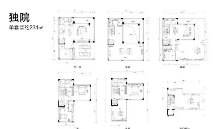 产品户型:建面约230-252m²,使用面积约700-1000㎡的传世院墅