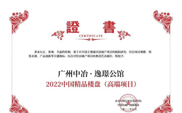 2022年7月7日,中冶 · 逸璟公馆荣获中指院“2022中国精品楼盘TOP1(高端项目)”。