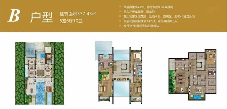 5室4厅7卫;地上二层,地下一层;单层净挑高4m;超大阳光平台;超大前入户停车花园,双车位;私家泳池花园层层叠加设计,配58㎡独立泳池,活动平台;烧烤区;前后花园设有独立入户门,业主可自由出入;步行2分钟即可到达沙滩海边。