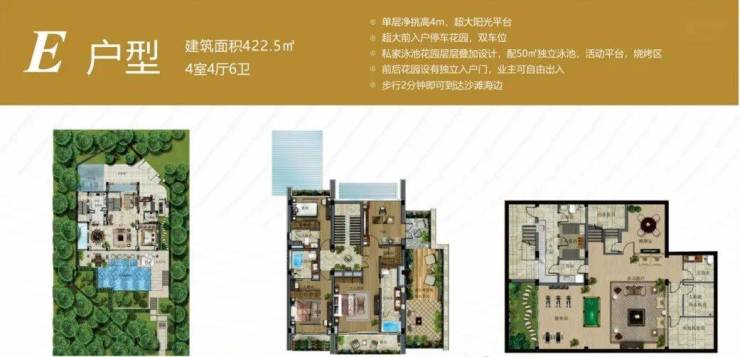 4室6厅6卫;地上三层,地下一层;单层净挑高4m;带有电梯预留井;三层超大观海阳光平台;停车双车位;私家泳池花园配30㎡独立泳池;活动平台;前后花园设有独立入户门,业主可自由出入;临近万达影城,步行2分钟即可到达沙滩海边。