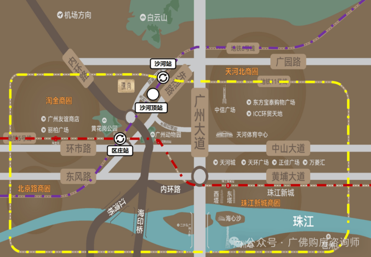 20分钟内可抵达环市东、珠江新城、北京路、白云新城等主轴商圈,周边环伺太古汇、万菱汇、正佳广场、天河城购物中心、ICC环贸天地等大型综合商业,满足多元消费需求。