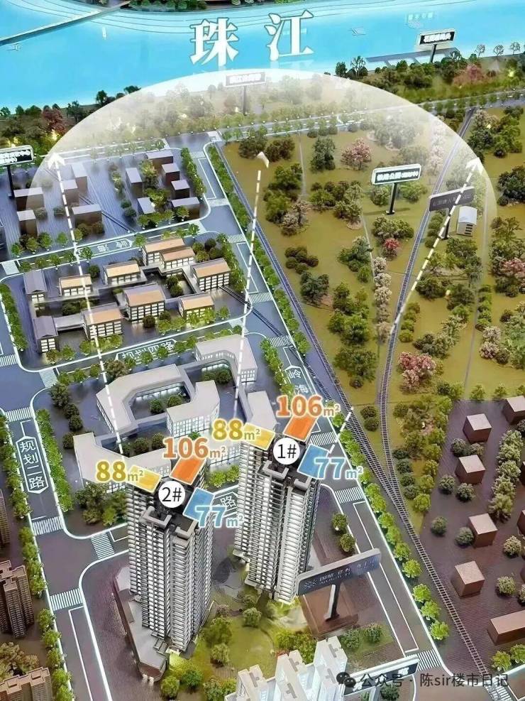 88㎡西南向为南北对流户型,高层视野开阔,能看到白鹅潭三江汇聚;东南向是竖厅户型,以园景、城景为主。
