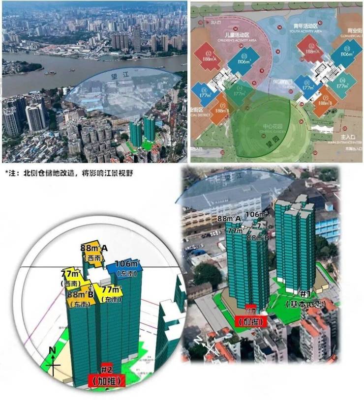 首推1栋,约77-88-106㎡户型,全南向,且使用率超100%。东南77㎡、南北对流106㎡,以及南北对流88㎡,这三个户型10多层以上可以看江