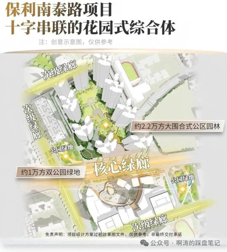 这条十字中轴沿着南泰路两侧展开,把地块南北两侧、住宅区内部的集中绿地串联,构建出约3.2万方社区内大花园 + 外部双公园结构;