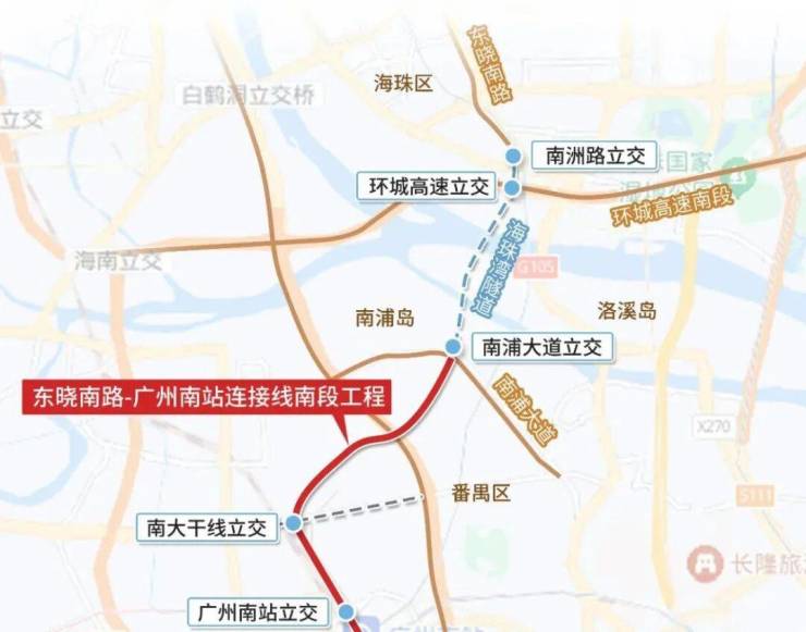 东晓南路 - 广州南站连接线南段将在 2025 年与海珠湾隧道同时建成通车,实现南站和海珠城区约 15 分钟互通,30 分钟连通珠江新城 CBD。