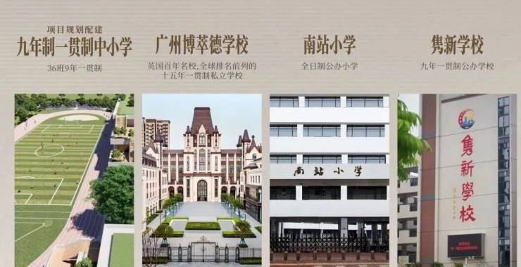 项目 074-1 地块配建 36 班九年制学校,074-2 地块配建 9 班幼儿园,周边还有广州博萃德学校,涵盖了从幼儿教育到九年义务教育以及国际教育等不同类型的教育资源。