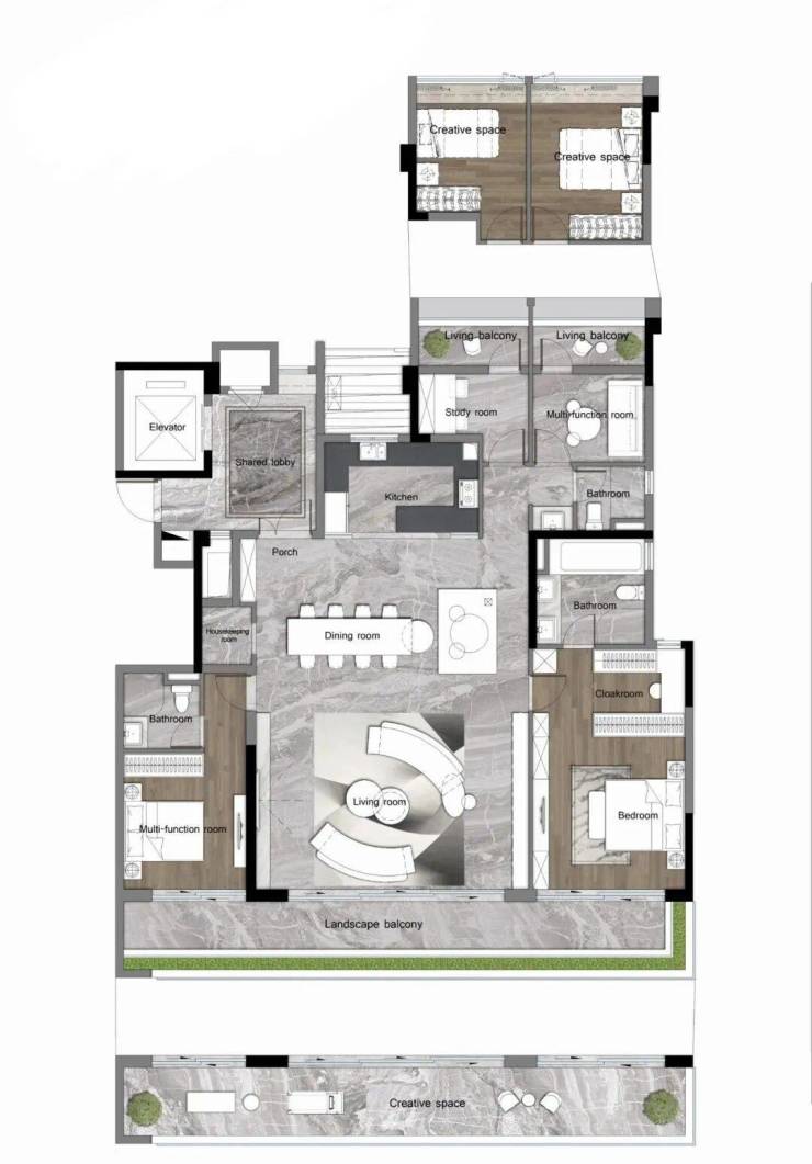 小区除了叠墅外,其他面积段的产品均为四房的产品。面积段覆盖120-204㎡。全部是以改善需求为主而设计的。