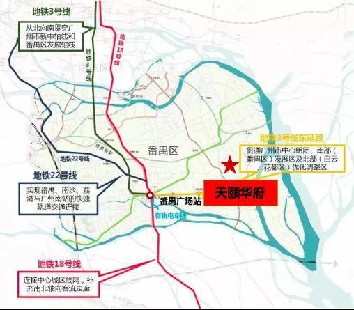 四地铁:地铁3号线,18号线(预计今年通车)、22号线(预计今年通车)、17号线(在建)番禺广场交汇站