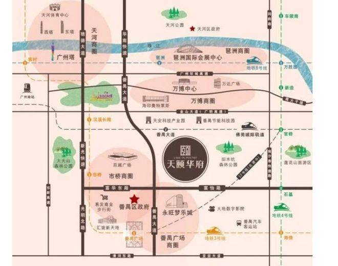 天颐华府位于广州市番禺区中心板块,踞位番禺广场TOD枢纽上。