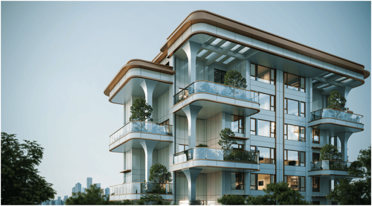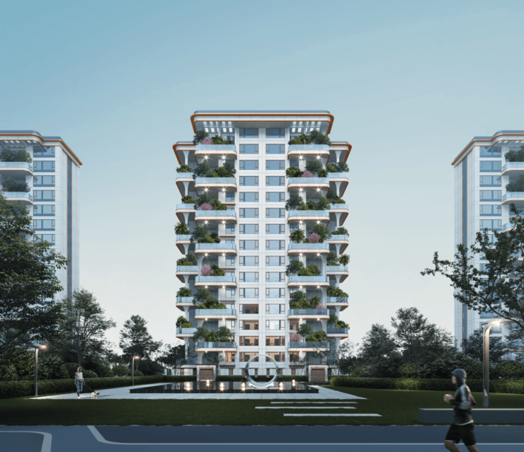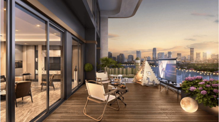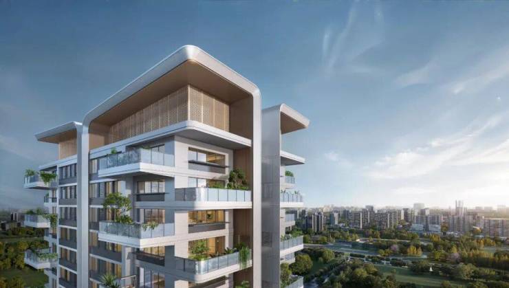 黄龙溪谷·枫林岸的“超四代宅”,单栋层数以24-26F为主,都是两梯四户、三梯五户的超高梯户比配置,采取错层布置,增设隐私挡板和造型遮挡墙等,以满足生态宅阳台的高度需求和隐私保护。