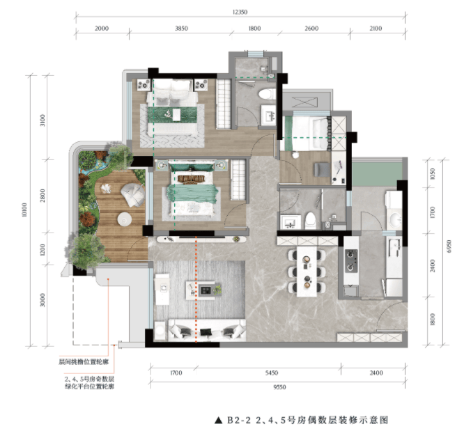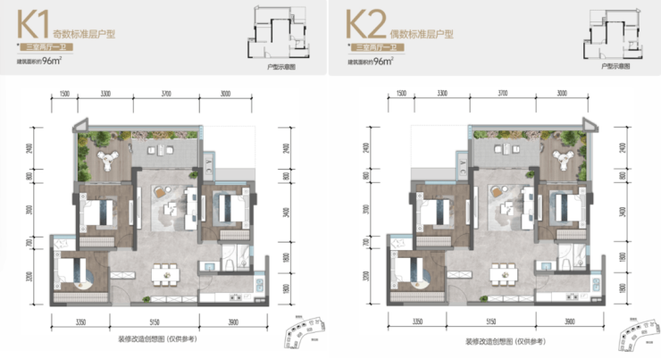 建面95㎡户型偶数层户型偶数层的露台花园露台主要为卧室空间的延伸,也能与客厅直接相连,面积约为12㎡,强化了休闲功能,为夏夜纳凉、闲时读书等静态活动提供了理想的空间。