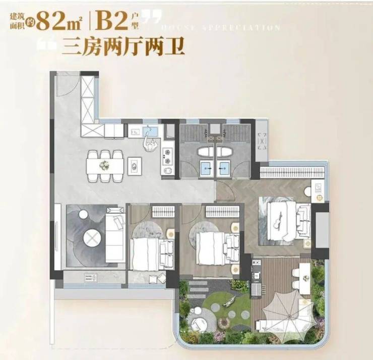 84-89㎡户型:更适合小家庭。庭院面积更大,甚至能打造 “分层式庭院”(一部分种花,一部分做亲子区);室内空间更舒展,比如 89㎡能做三房,每个房间都能沾到庭院的 “自然光”。