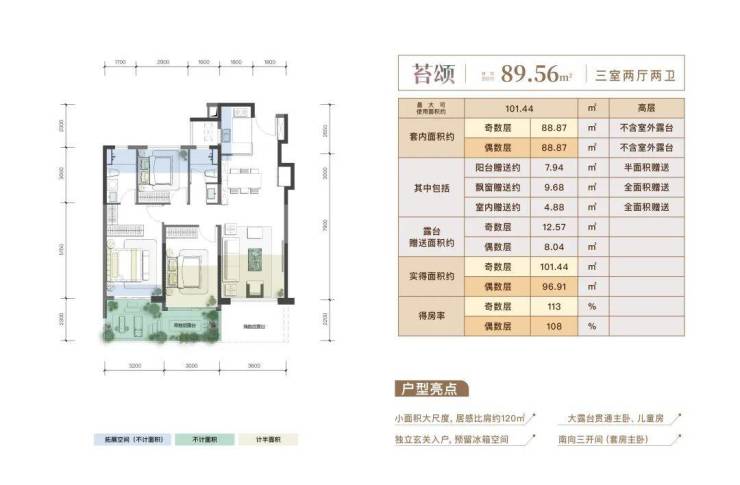 绿城·绿汀芳菲建面89.56㎡户型,最大使用面积可以达到101.44㎡(去除公摊面积)!