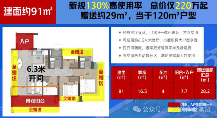 阳台、飘窗、花池N处赠送空间,所有户型阳台率20%,这个数值放到全广州,都少有对标者。加上官方严控空间赠送率,阳台率控制20%,恐怕也无后来者能超越。