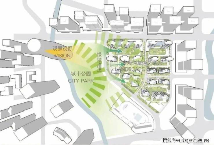 把小区西侧的城市公园视野引入社区,打造内院、外园的无界绿色视觉。