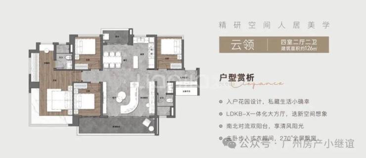 配入户花园,公卫设在玄关旁,方便外出归家简单清洗。LDKB大厅配南北对流双阳台,其中景观阳台开间去到7.8米左右。