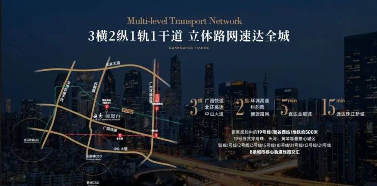 •3横2纵主干道,速通珠金琶,北环高速+广园快速+中山大道/环城高速+科韵路