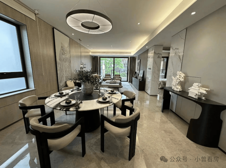 215㎡的山居平墅是热门户型,采用南北通透的格局,客厅连接7.2米宽的景观阳台,站在阳台上就能看到白云山的远景,阳光能直接洒进客厅,整个空间显得明亮通透。主卧面积约25㎡,配备独立卫浴和步入式衣帽间,保证了居住的私密性;