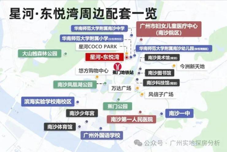 项目自带有一所3班托儿所、18班华南师范大学附属南沙幼儿园2023年开园,24班华南师范大学附属南沙小学,2022年9月开学,华南师范大学附属南沙中学,已开学。