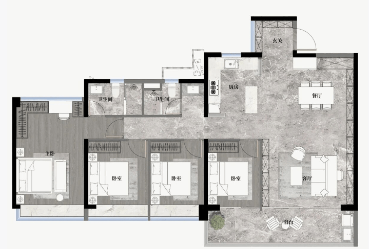 建筑面积105㎡的四房两厅两卫,四开间朝南,LDKB一体化设计,5.9m开间巨幕客厅,主卧270°全景飘窗。