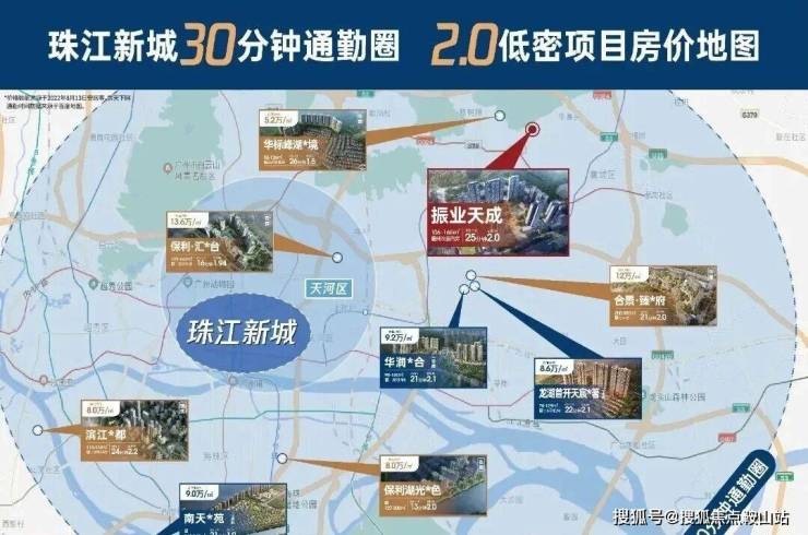 以珠江新城为中心,通勤时长30分钟为半径,振业天成是少有的售价6万/㎡以下的2.0容积率项目,相比之下,其他2.0容积率项目售价都高达8-14万/㎡