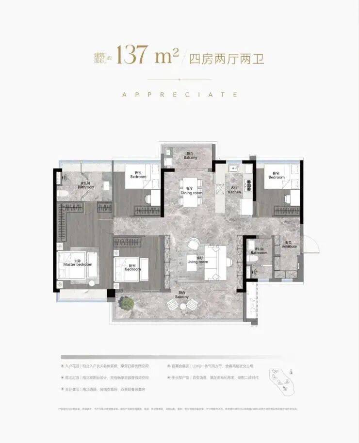 项目户型覆盖105㎡至188㎡四房,设计遵循超新规理念,得房率高、空间利用率优越。105㎡四房南向园景户型,四开间朝南,LDKB一体化,5.9米巨幕客厅搭配主卧270°全景飘窗,营造宽阔通透的生活体验。128㎡四房南北通透,14米面宽与8.65米IMAX阳台,实现主卧步入式衣帽间布局。户型兼顾功能与景观,既满足家庭生活舒适性,也优化采光、通风与空间扩展潜力,是改善型购房的优质选择。