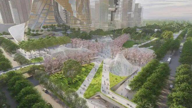夜景光影与相交的花旗木大道配合,打造极具设计感的车站广场空间。