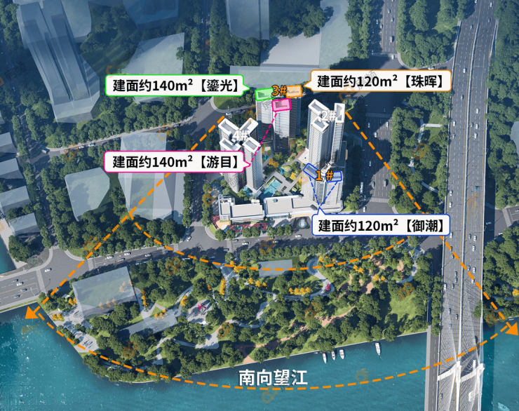 距离珠江直线距离不到300米,前面的江边地块规划为绿化及消防设施,所以未来基本都不会影响望江。