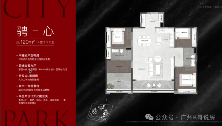 该栋为25层高,两梯三户设计,只有两个面积段,120㎡和140㎡,户型做得不错,在景观展现上用了功,极大程度去放大观江面,比方说超宽阳台、L型主卧转角飘窗、客厅预留观景飘窗等等,主打改善户型,2025年9月整体交房。