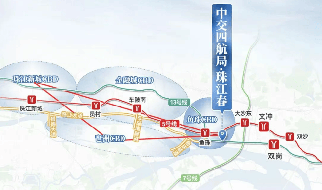 项目同时紧邻地铁5号线与地铁13号线的交汇站点(鱼珠站),与地铁5号线大沙地站的直线距离仅约600米,双地铁站护航,交通条件优越。