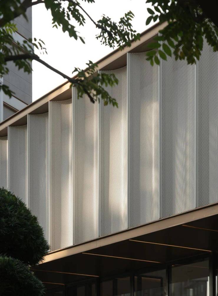 建筑立面采用大面积的玻璃幕墙,层间配合以横向银白色与香槟色金属线脚,竖向装饰线条从底层升至屋顶微微起翘挑出屋檐,“如鸟斯革,如翚斯飞”的现代演绎,轻盈灵动。