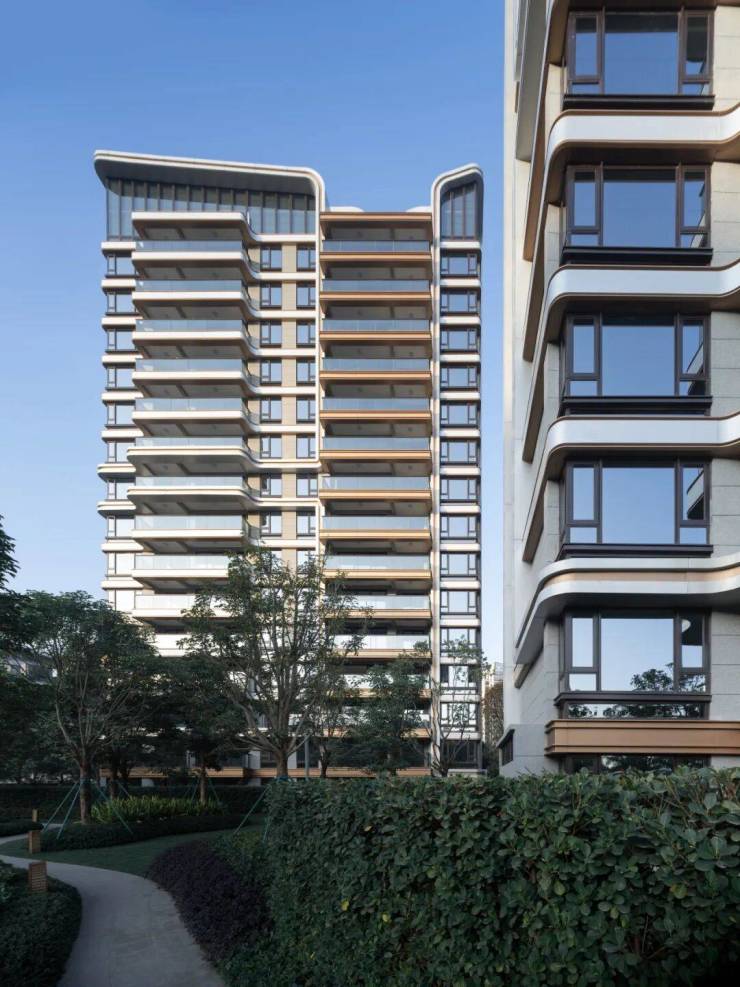 去除多余的装饰语言,住宅的立面与周边地景保持着统一。在户型设计时,简洁的平面空间关系,使得建筑外轮廓平整,立面呈现简洁的建筑表情。