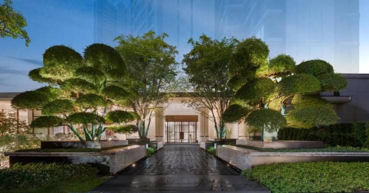 大境从设计源头就把景观、大堂、建筑立面拉通,铺装缝隙精准对齐,台阶全部抹平。