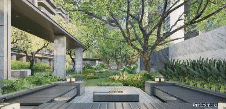 目前推售二期,相比一期,二期的密度整体更低,容积率仅2.0,只做了8栋住宅,内部预留了大面积的园林空间,形成复合景观,舒适度和私密度都更高。