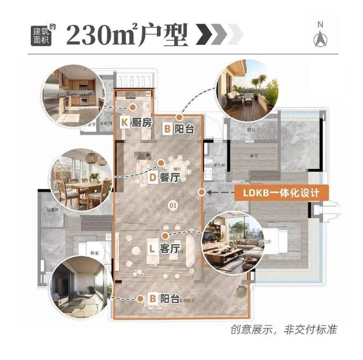 230平户型拥有私家电梯厅、双主套、独立佣人房、南北对流、LDKB大方厅、主卧L型270°飘窗等,大大提升了整体的空间体验。