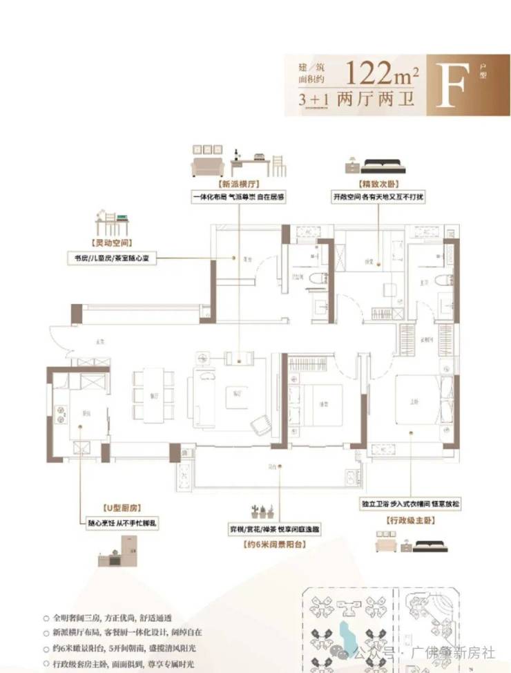 F户型:建面约122㎡ 3+1房两厅两卫