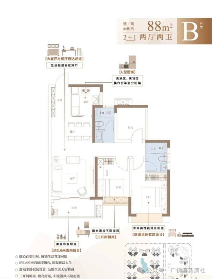 B户型:建面约88㎡ 2+1房两厅两卫