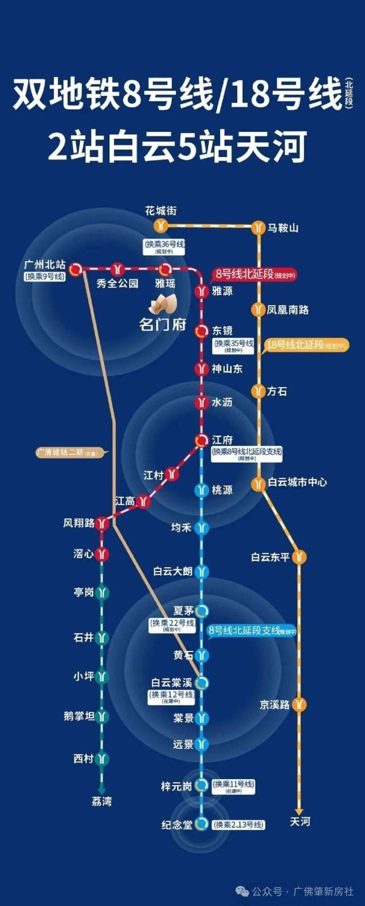 双地铁旁,紧邻在建地铁8号线北延段雅源站(距离项目500米)。往北三站接驳广州北站TOD实现空铁联动,往南经8号线北延段支线直达越秀纪念堂站,享受全市一小时生活圈,距离项目一站之隔的雅瑶站点已进入施工阶段,距离在建的18号线北延段凤凰南路站2公里 ,5站直达天河。