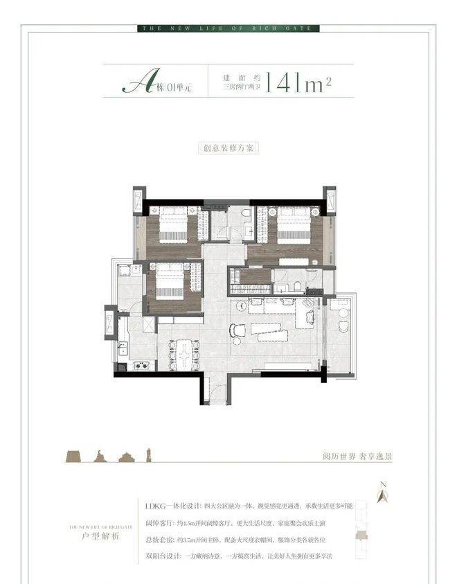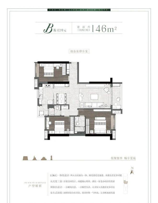 2梯3户全屋对流板式设计,通风采光俱佳,在城芯显得弥足珍贵;LDKG一体化奢阔大方厅、L型飘窗270°巨幕视野等设计,满足家庭成长的改善居住需求,诠释阔绰宽境大家风范。