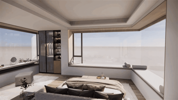 而建面约86㎡三房,以及约105、126㎡四房,主套则配置有270°无立柱景观飘窗、超大衣帽间。