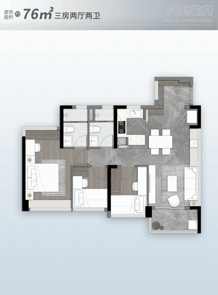 即便建面约76㎡的最小户型,也做到了三房带主套。