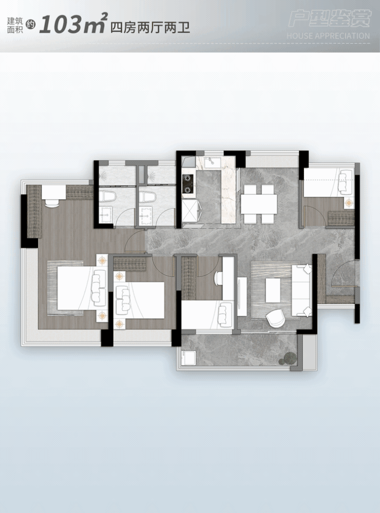 建面约103㎡四房,则是私密单边位设计,南向连绵约14米面宽,直望中央公园。