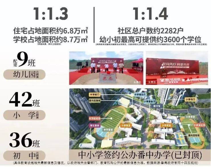 2. 教育配套项目自建教育配套完善,包括一所9班幼儿园、42班小学及36班初中,提供超过3600个学位。学校由番禺中学负责运营,师资力量雄厚,且招生政策主要面向小区内部业主子女。