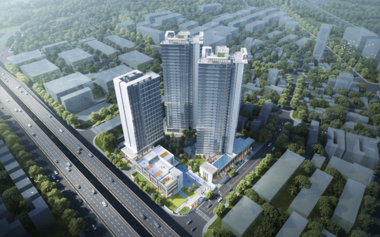 项目规划了1栋商业楼(17F)、1所幼儿园(3F)在路边,2栋住宅(32F)