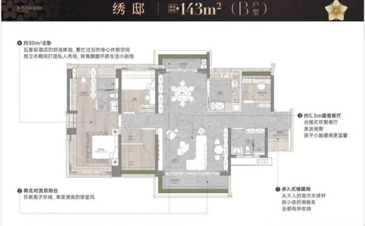 建面约143㎡的四室两厅两卫户型,空间感更开阔,客厅搭配景观阳台,推开窗户就能看到市桥水道的江景,部分房间带飘窗,进一步增加了采光和使用面积。这个户型的动线设计合理,公共区域和休息区域区分明确,适合人口较多的家庭同住 。