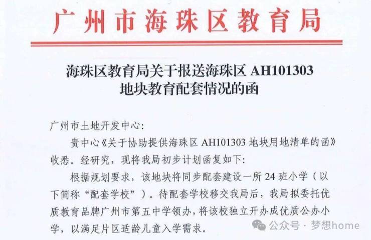 重要的是,根据2024年10月海珠区教育局公示,这所配建的学校将委托广州市第五中学领办。
