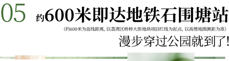 建鑫·如意芳华与地铁11号线石围塘站约600米的距离,恰到好处地平衡了便捷性与安静度。未来业主可通过公园绿带系统舒适步行至地铁站,实现“公园漫步式通勤”。(约600米为直线距离,以荔湾区桥梓大街地块项目红线为起点,以高德地图测距为准)